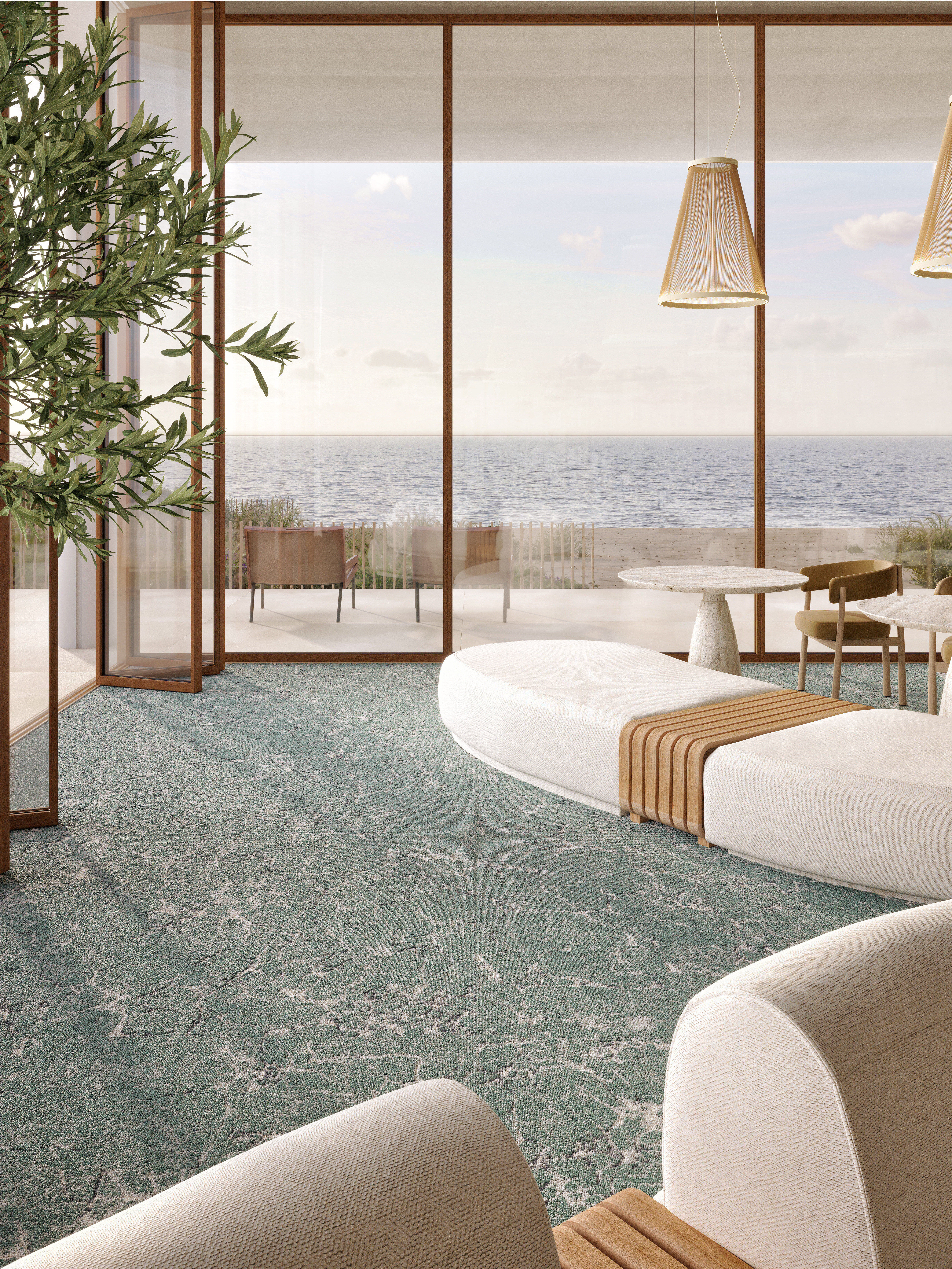 De textieltegels Baltique HD bootsen dit precieze moment, waarop het zeewater bevriest, met een surrealistische schoonheid na. Het groenblauwe water vormt onregelmatige stroompjes tussen de glinsterende, doorschijnende uitgestrekte ijsvlaktes. Wat een genot om de schoenen uit te doen, en op blote voeten te lopen over deze zachte, uitnodigende ijskap! Een fascinerend decor dat een kantoor of een coworking-ruimte een rustgevende aanbik verschaft.
