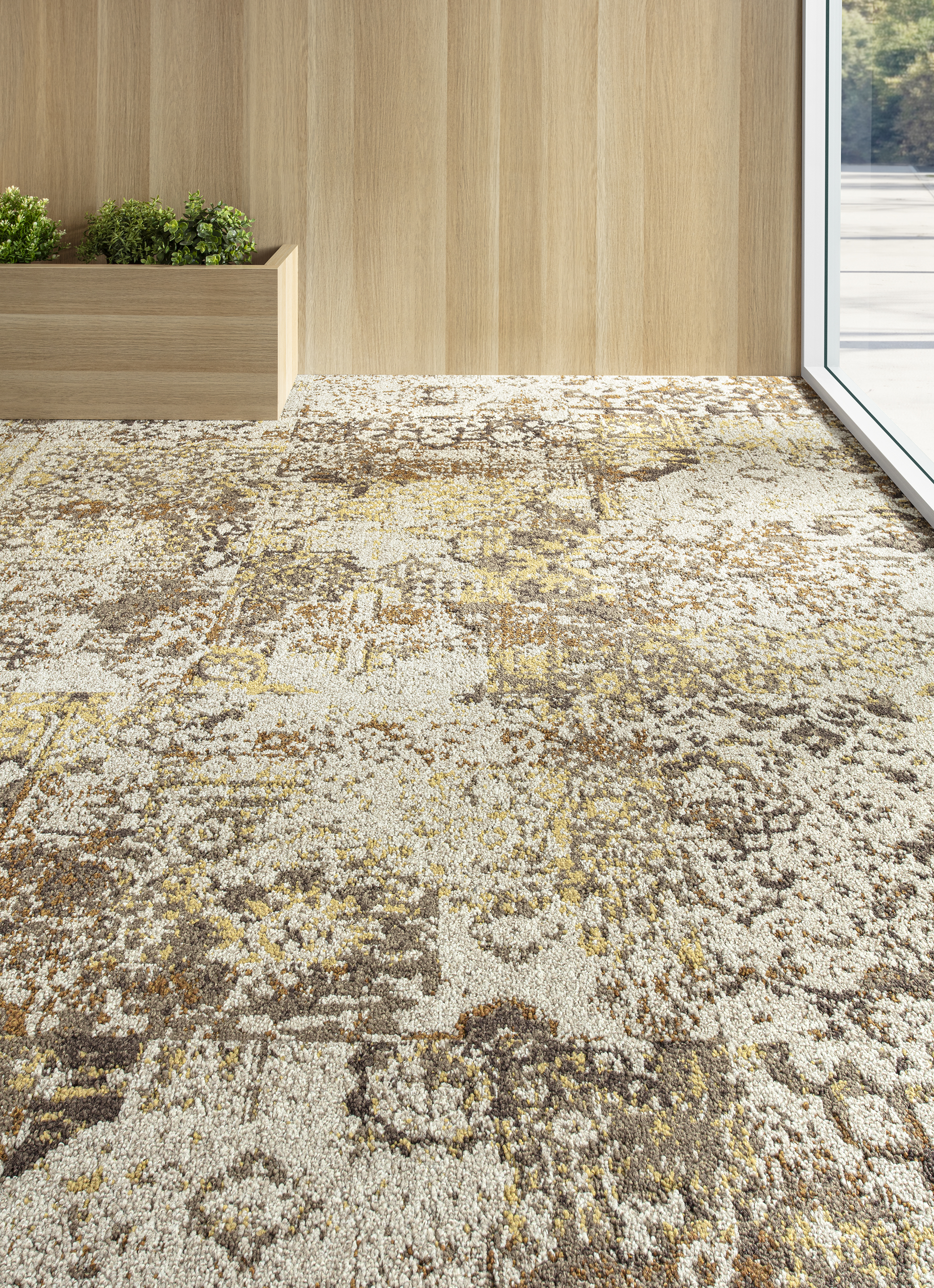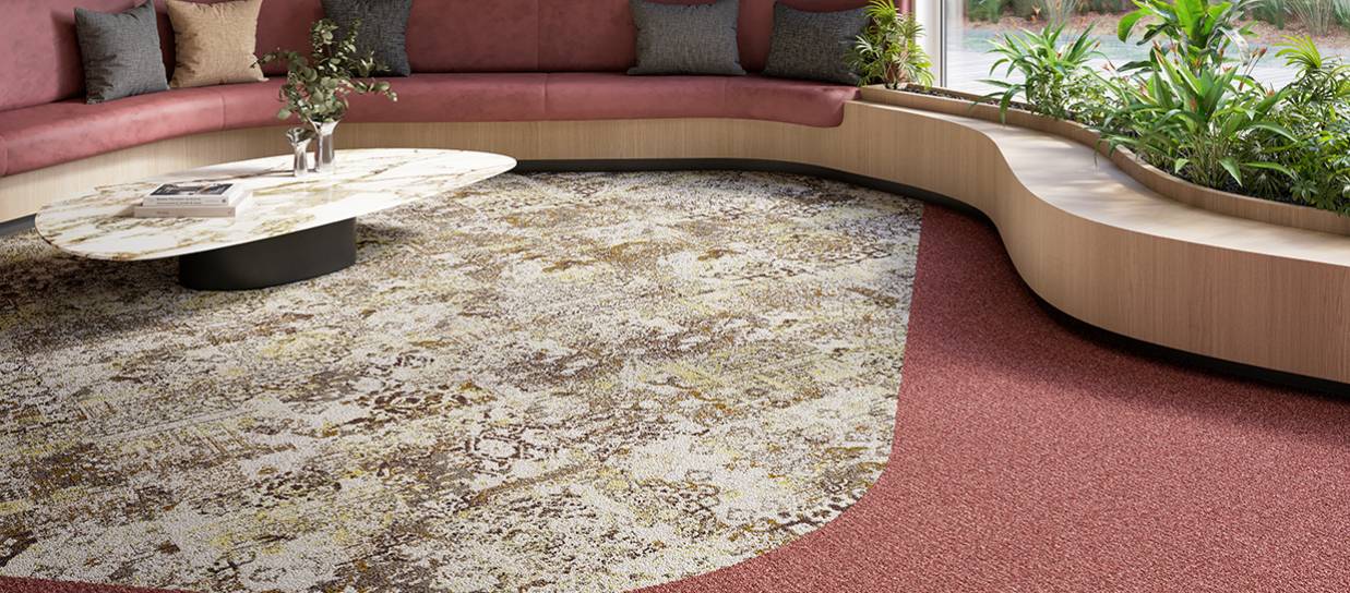Een haute-couturetapijttegel met structuur, gemaakt van in de massa geverfd Econyl®-garen voor chique ruimtes